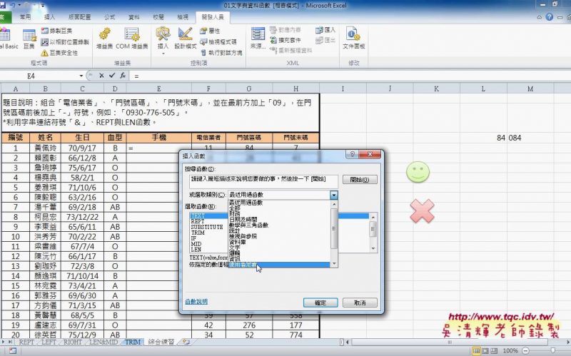 東吳EXCEL VBA與資料庫雲端設計第1次上課(89文字函數) 上課內容: 01_問卷結果與課程內容說明 02_如何運用文字類函數串接手機號碼 03_如何用文字函數串接手機號碼 04_如何將函數轉換為VBA與環境設置 05_VBA環境介紹與如何連結按鈕 06_如何自訂手機函數說明 07_如何將自訂函數來源引數改為範圍 08_課程雲端補充方式說明 完整影音 https://www.youtube.com/playlist?list=PLgzs-Q3byiYOFFUEoVQT-IIsTKySRel6H 教學論壇(之後課程會放論壇上課學員請自行加入): https://groups.google.com/forum/#!forum/scu_excel_vba_89 懶人包: EXCEL函數與VBA http://terry28853669.pixnet.net/blog/category/list/1384521…